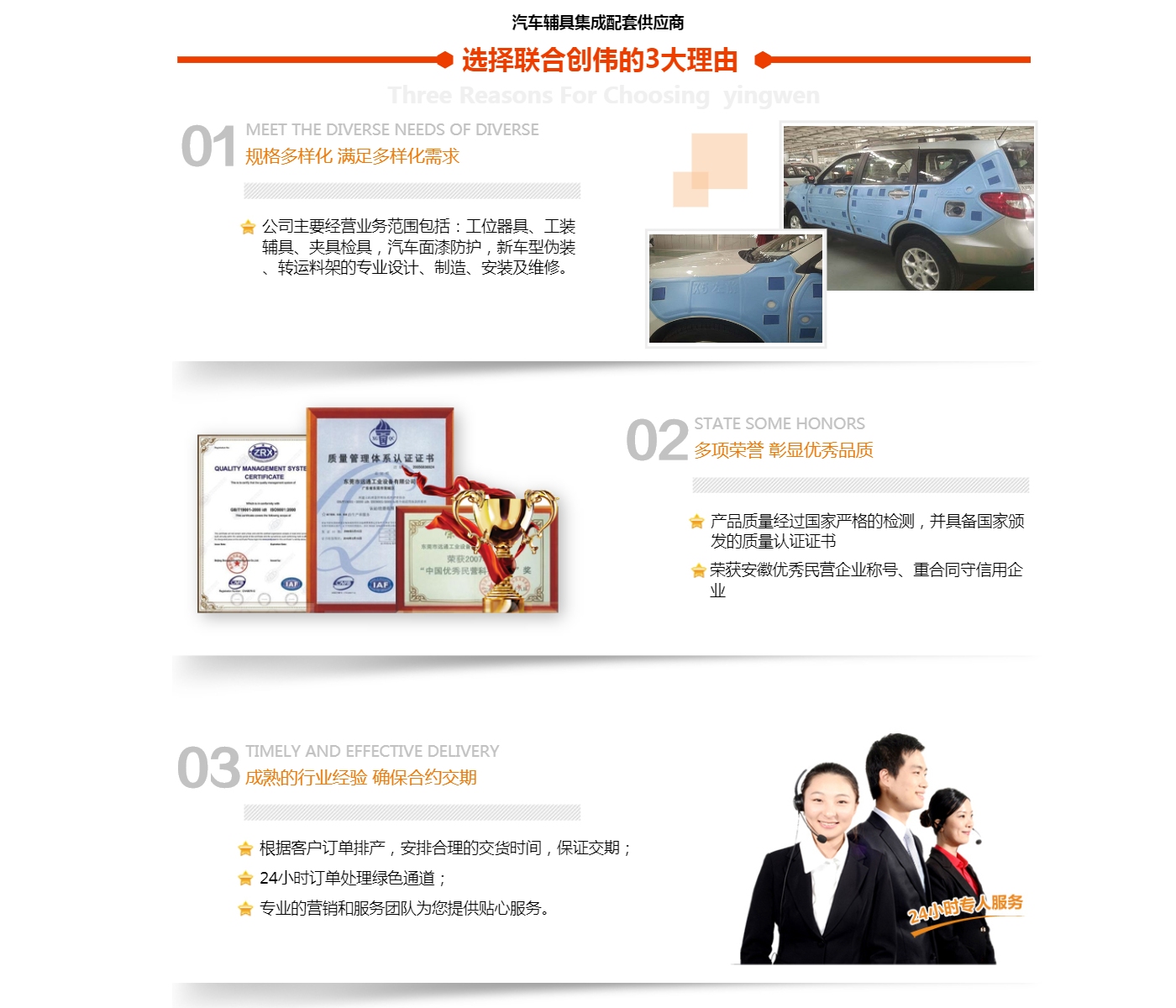 蕪湖聯(lián)合創(chuàng)偉汽車技術(shù)有限公司,座落于風(fēng)景秀麗的皖江之畔——安徽蕪湖,緊鄰國(guó)家經(jīng)濟(jì)開(kāi)發(fā)區(qū)蕪湖經(jīng)濟(jì)開(kāi)發(fā)區(qū)。公司本著為客戶創(chuàng)造價(jià)值的服務(wù)的理念,力求以高的產(chǎn)品工程和優(yōu)良的售后服務(wù)參與市場(chǎng)競(jìng)爭(zhēng),獲得社會(huì)效益和經(jīng)濟(jì)效益,通過(guò)不斷的優(yōu)化,來(lái)滿足客戶日益增長(zhǎng)的需求。公司主要經(jīng)營(yíng)業(yè)務(wù)范圍包括:工位器具、工裝輔具、夾具檢具,汽車面漆防護(hù),新車型偽裝、轉(zhuǎn)運(yùn)料架的設(shè)計(jì)、制造、安裝及維修。在此方面有很好的業(yè)績(jī),獲得了客戶的廣泛認(rèn)可和好評(píng)。公司宗旨:誠(chéng)信、服務(wù)、進(jìn)取公司以誠(chéng)信為企業(yè)立足之根本,精心施工、信守合同,向客戶提供的產(chǎn)品和服務(wù),遵循以人為本,以為客戶提供更好價(jià)值和堅(jiān)持用戶滿意為服務(wù)目標(biāo),...